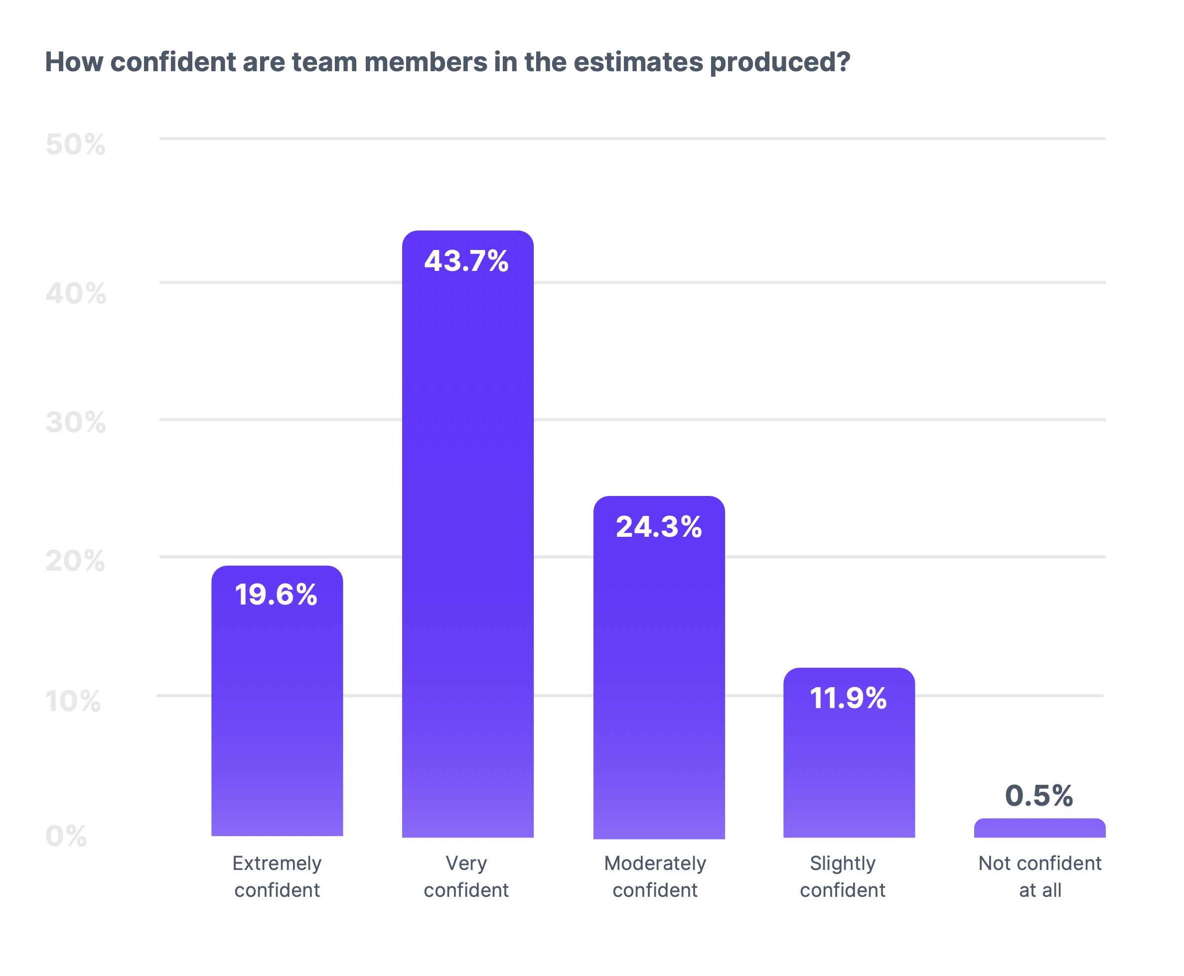 Most teams feel good about their estimates. 63% of teams report feeling confident or very confident in their task estimates. However, 44% miss the mark on half their work or more.