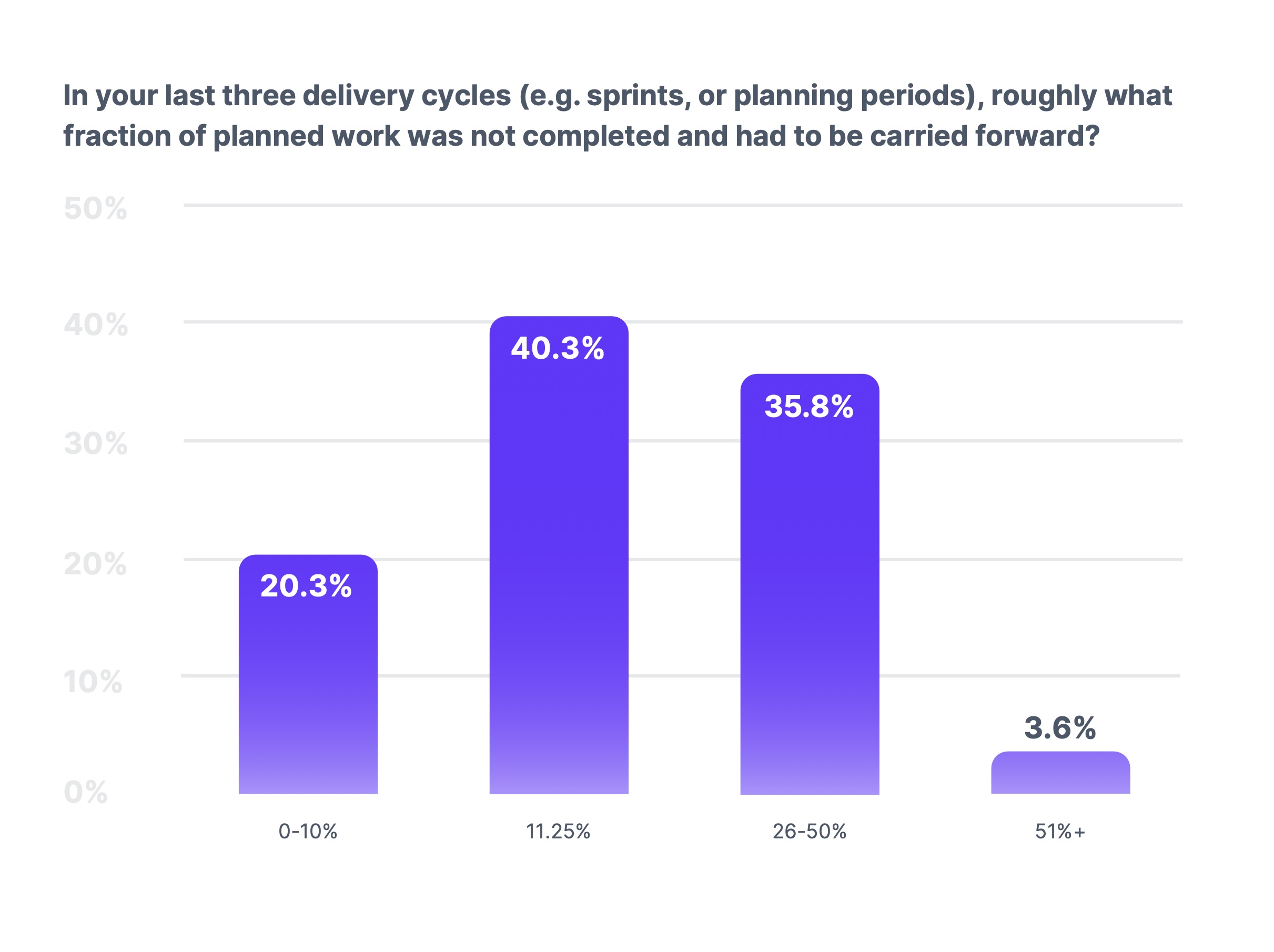 Only 20% of teams maintain minimal rollover (0-10% of planned work). The other 80% regularly move incomplete work forward, with over a third rolling 26-50% of their sprint into the next cycle.
