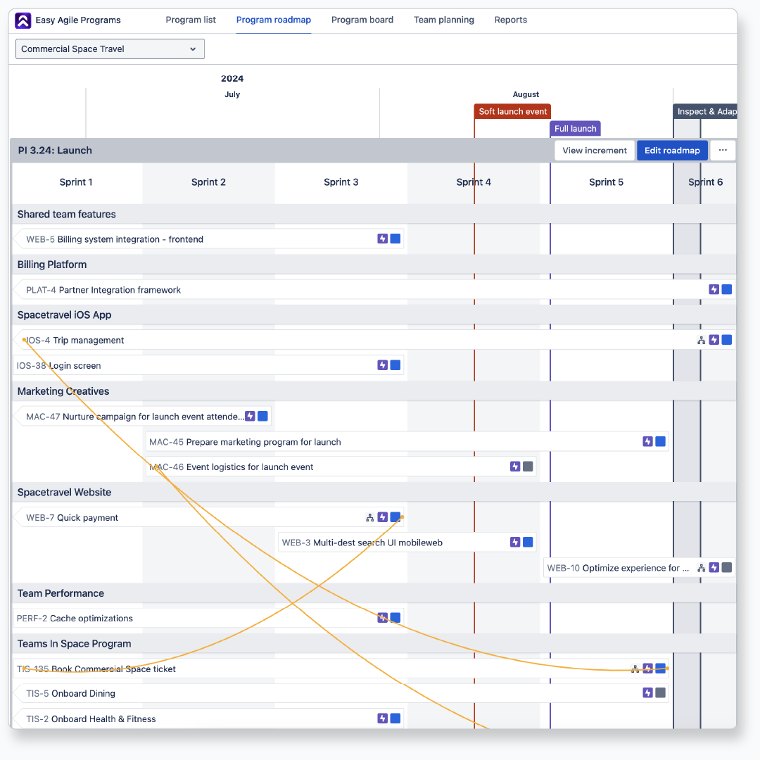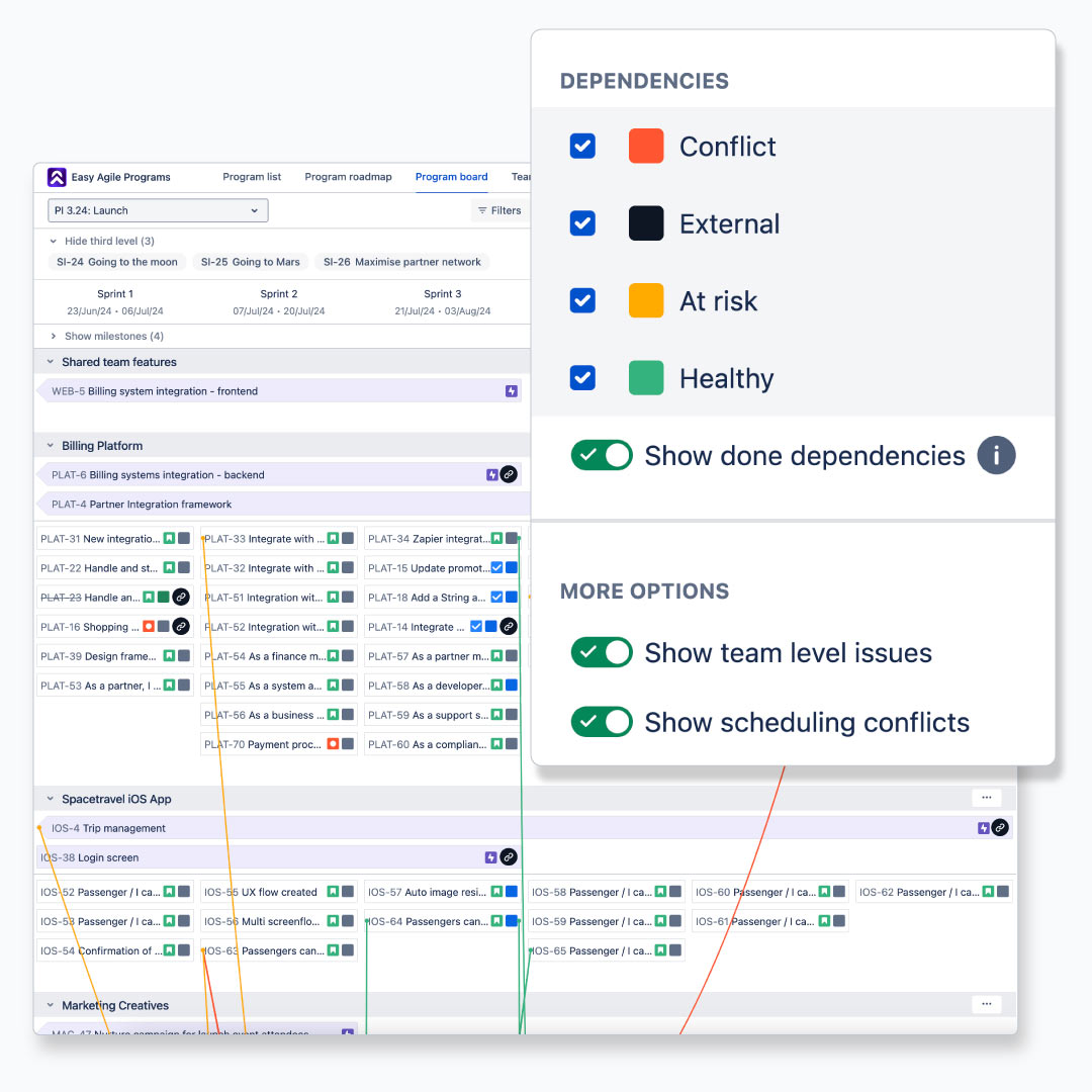 Easy Agile Programs brings together teams to connect strategy and delivery in a single tool in Jira. With a Jira-native Program board with built in dependencies, and dedicated team planning boards with PI objectives, the work starts - and stays - relevant to the plan.