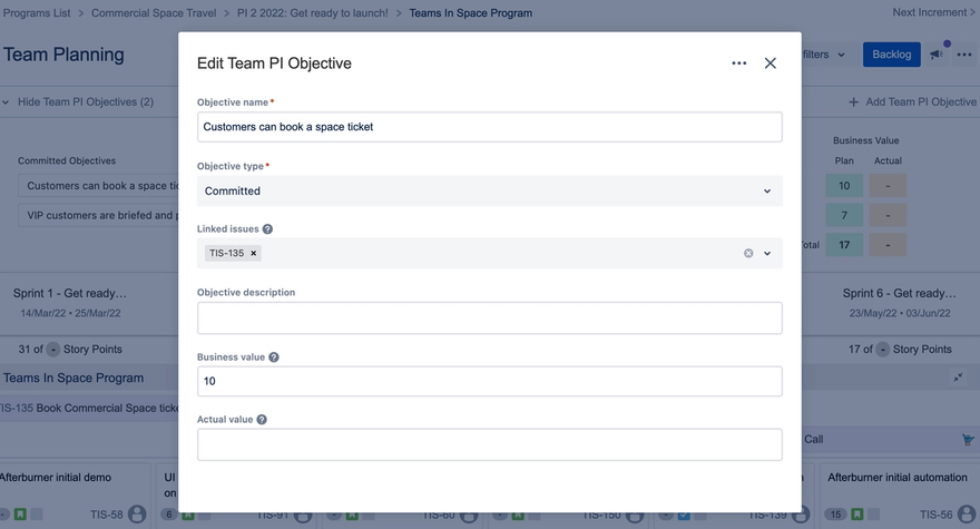 - PI objectives link the scheduled features to broader business objectives and value. This helps align work that needs to be done with broader business goals. They are then broken down into committed and uncommitted objectives.