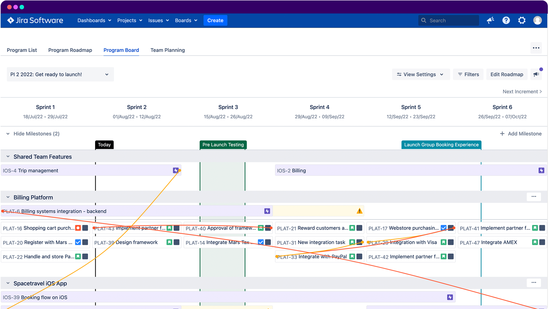 Yes! The Program Board highlights dependencies across multiple teams so that teams can identify blockers and risks, resolve bottlenecks, and adjust plans in real-time to reduce risks and maintain alignment.